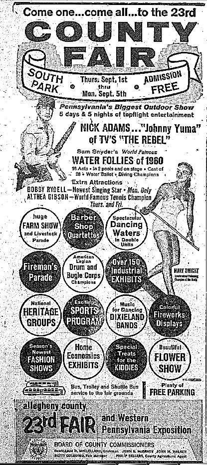 Although I didn’t find reference in the Duquesne Times to McKeesport’s International Village, there was another late summer event that was well represented. How many of you recall attending the Allegheny County Fair at South Park Fairgrounds?