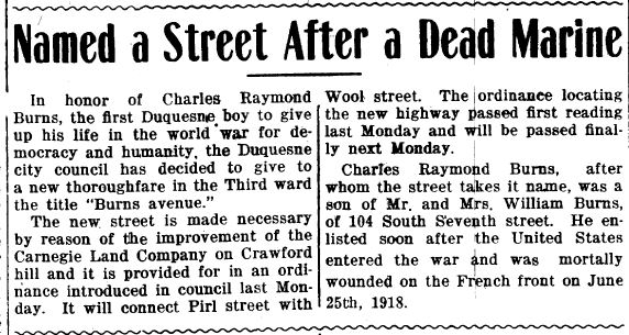 How things change. Look at the Google map today and Burns Avenue runs from the city line at Mifflin St. east down to Thorn Alley at the boundary of the now razed Burns Heights project. Pirl St. now extends from Mehaffey, is cut off by SS Peter & Paul parking lot, then crosses Crawford Ave. only to end at an unnamed alley along another edge of Burns Heights. Not sure of date of the article, Jim, but when Carnegie Land Company sold their property, that hero also was remembered in the name of that area of housing. I recently asked Mom what happened to the plan to rebuild single family housing on the now demolished and fenced in site, she related that they were unable to proceed as the area was atop an abandoned mine site and funding was cancelled. I wonder how the Carnegie Land Company (by then a division of US Steel?) was able to sell the property to the Allegheny County Housing Authority so they could build all those homes….