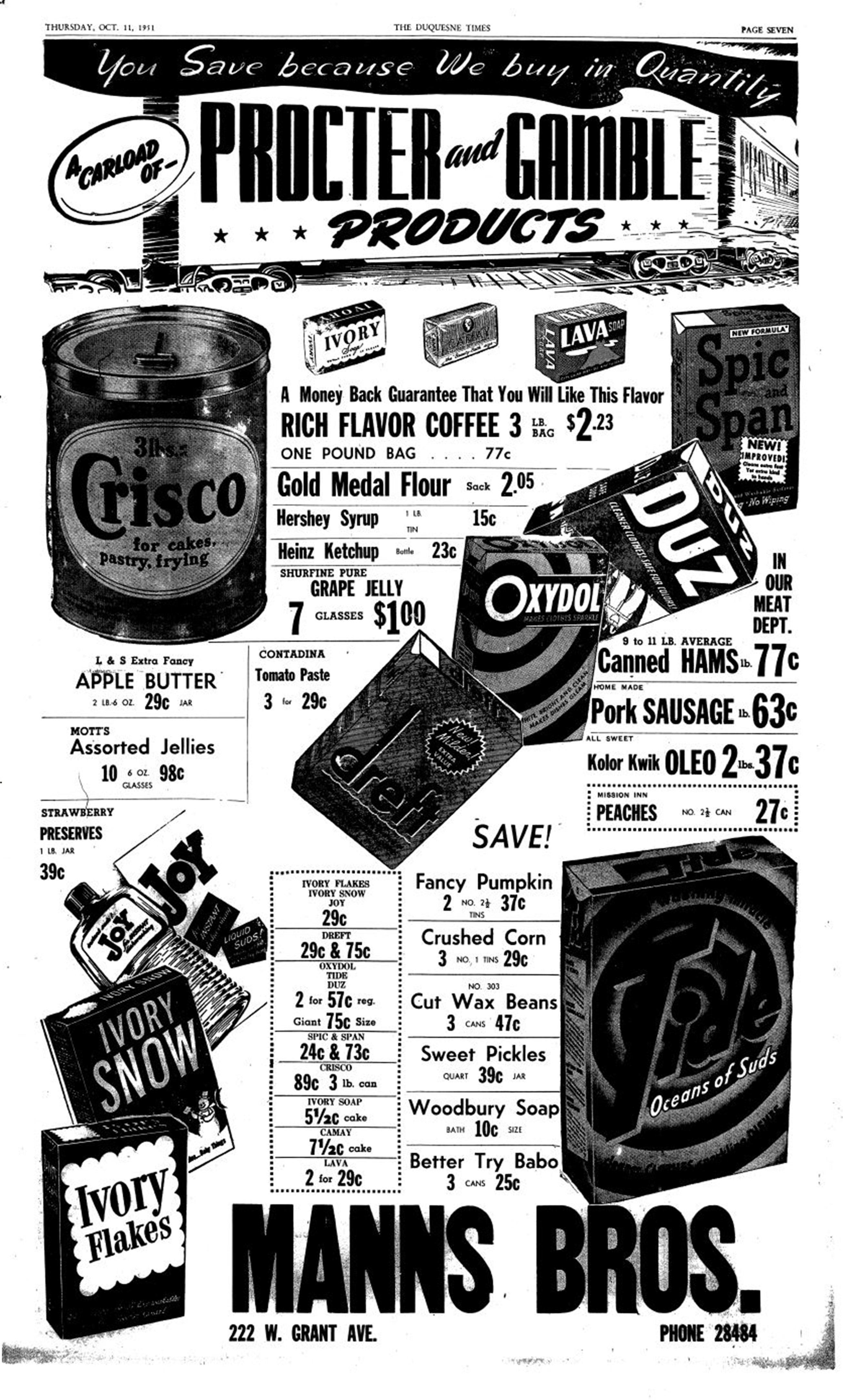 I found the following photograph and ad very interesting and amusing! You know it had to be a REALLY slow news day when one of the front page photographs pays homage to a shipment of SOAP to Mann’s Brothers! To add even more “local charm” to that day’s edition of The Times from October 11, 1951, is the full page Mann’s Bros. ad that appeared in the same edition! Gotta love free press! Take a few minutes and check out the ad. It has been a LONG time since I’ve seen some of these brand names……