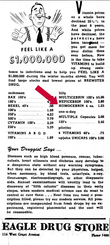 OK, here’s a thought from left field for you to think about. Who remembers being given some sweet, wonderful tasting, yellow syrupy liquid that Mom used to keep in the fridge? Homocebrin! Just before bed each evening, Mom would call my brother and I into the kitchen for our teaspoonful of the “it’ll make you grown up stronger and stronger” elixir. We never hesitated since it tasted so good. I remember the dark brown bottle and how the liquid just seemed to ooze out. I found an ad in the Duquesne times that advertised the vitamin and thought you’d enjoy seeing it and the “medicine showish” advertising! Kinda reminds me of Lucy Ricardo hawking Vitameatavegamin on I Love Lucy!