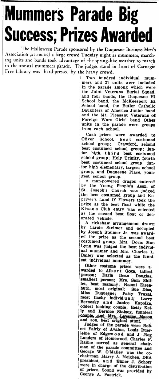 Funny you should write about Halloween after reading the Times. I was recently looking through 1930 issues of the Duquesne Times, and the Mummers Parade articles really sent me down memory lane as well. Halloween was sure different when I was a kid. My mother always sewed us unique costumes out of old drapes or inexpensive fabric, and we would participate in parades. Her costumes frequently won prizes in the competitions associated with the parades. I also remember we always had a Leonard Staisey campaign sign out in our front yard at election time! I personally did not know him, but my dad did. And yes, Candy was safe to eat and we got so many full size candy bars in our stash! Now those were the days! Thanks for the memories, Jim!