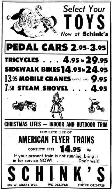 In 1953-54 we lived in an apartment on Grant, a door or two down from the fruit stand. I was too young to realize the toys I received at Christmas did not come from the North Pole but rather from Shinks right across the street. It wasn’t until a few years later after we moved to Goldstrohm Lane and I was allowed to accompany my father upstairs to shop for toys for my younger sister Evelyn that I found out where my 24″ Columbia bicycle and my American Flyer train set complete with a car that unloaded a fuel truck had came from. Sadly by the time my children were listening for sleigh bells and footsteps on the roof Santa had already closed down his Grant Avenue workshop.