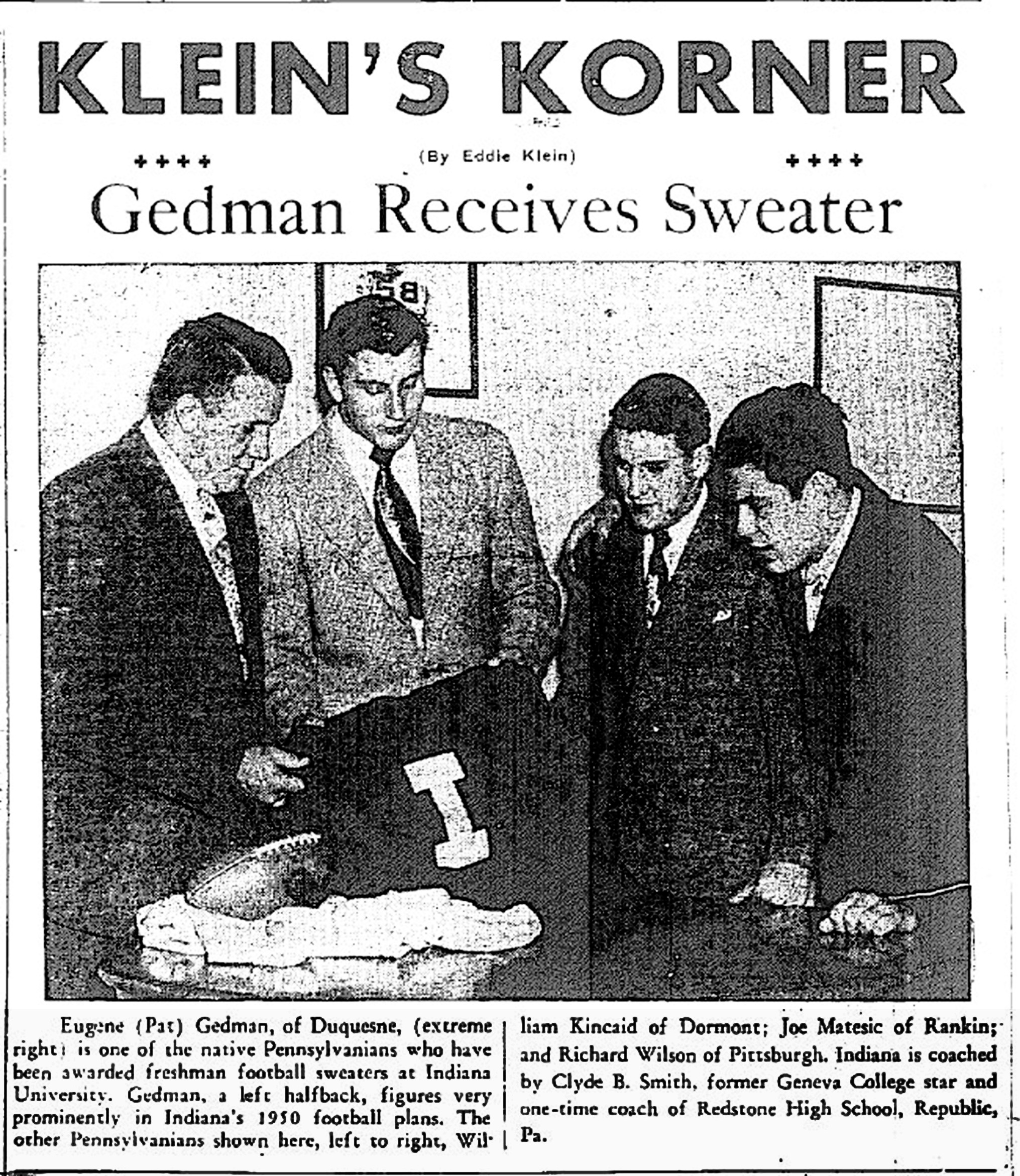 Of course, I’m taking the easy way out with this post by presenting a few tidbits and snippets of Christmas and Duquesne articles and photos for your enjoyment. The first is a non-Christmas photograph that I ran across that was featured in 1949 Christmas edition of The Duquesne Times. It features one of Duquesne’s sons as he received his freshman football sweater from Indiana University: