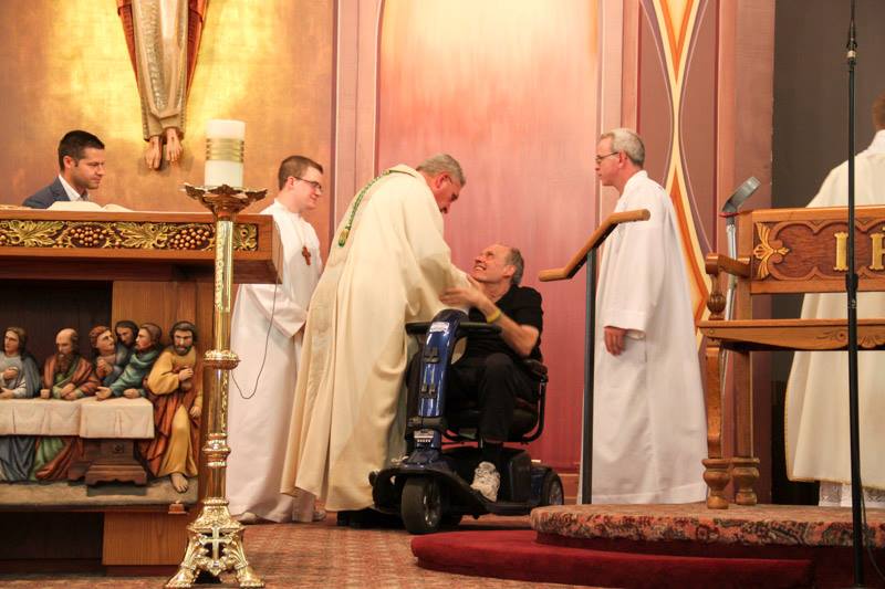In the 15 months since my post and Fr. Dennis’ initial announce, a lot has changed in his life. The diagnosis of ALS was confirmed and he has been bravely dealing with all of the aspects of the disease without complaint. The sanctuary of Holy Name has been remodeled and an elevator installed in the rectory. He gets around with a walker or scooter and recently was fitted for a wheelchair. He no longer is able to drive because he’s lost use of his right leg. The loss of simple movements have left Fr. Dennis an undaunted spirit and determination to continue to minister to his parishioners.