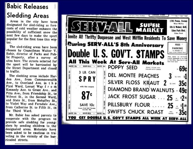 “With no streetcar and only limited bus service, some employees made it to their businesses the hard way — by walking,” The Mail reported. “Some trudged into Charleroi through the deep snow from outlying districts in Belle Vernon, Dunlevy, Long Branch, Twilight, Fallowfield Township, Fisher Heights, North Charleroi, Mapleview and even Elco.”