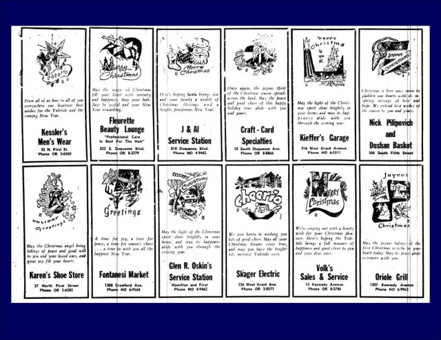 Pictures on the front page of The Daily Independent showed snow cleared from Donner Avenue and sidewalks piled nearly to the top of the parking meters. The large parking lot at Pittsburgh Steel was closed and many vehicles there were completely covered, and virtually hidden, by snow.