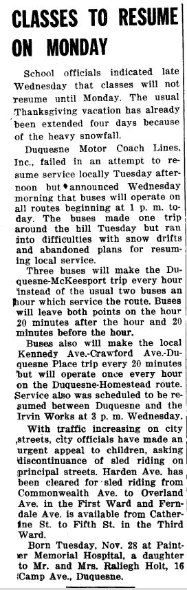 The following article appeared in The Duquesne Times on November 30, 1950. There was no Times published on November 23, 1950 due to the snowfall. Unfortunately, there were no photos in the Times published on November 30th, so a photojournalistic account of the snowfall does not exist.