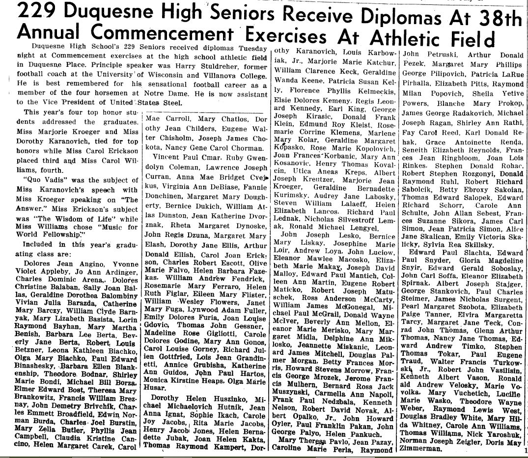 Lived in Duquesne from birth (1927) to after graduation from Duquesne High in 1945.